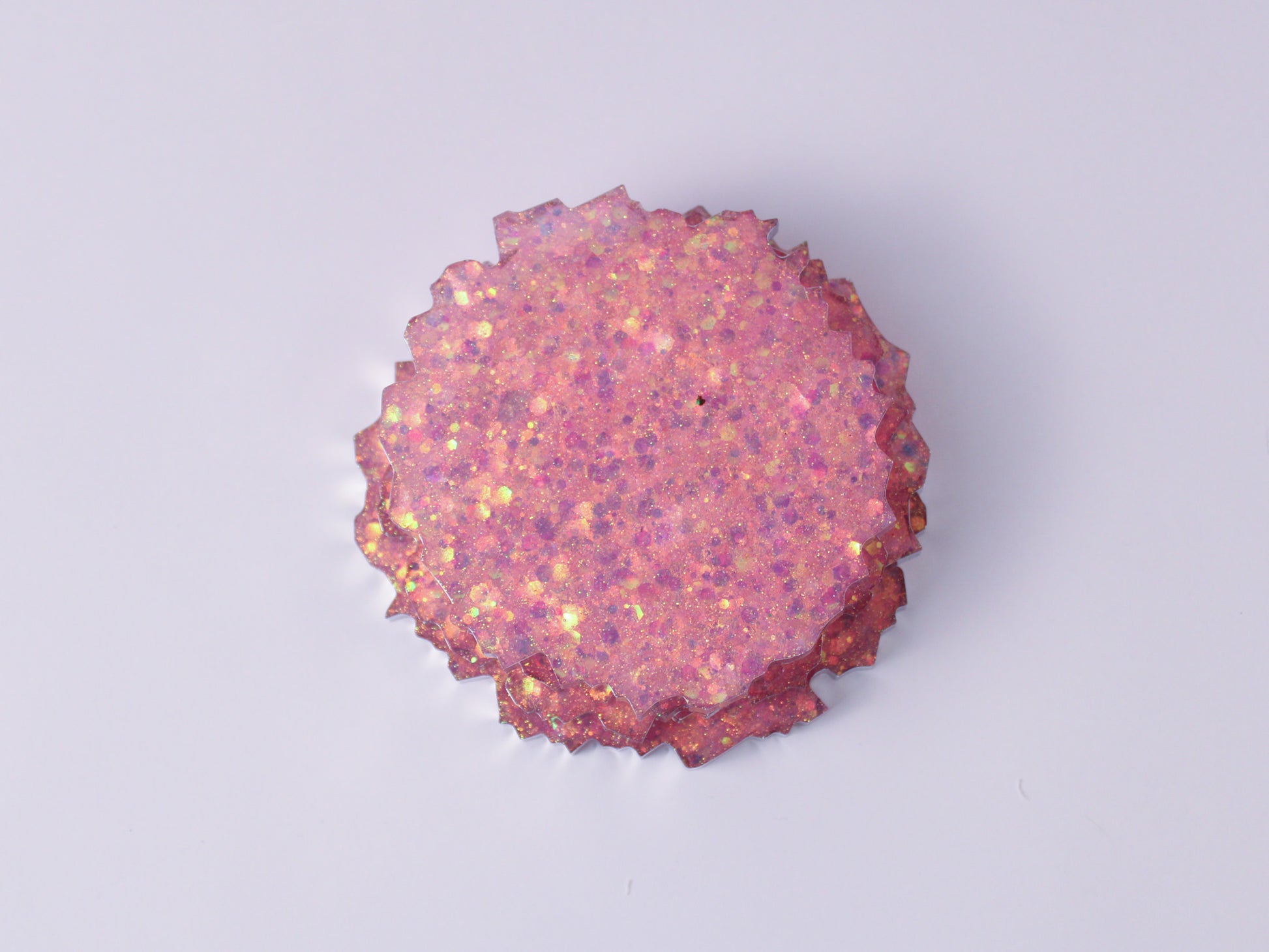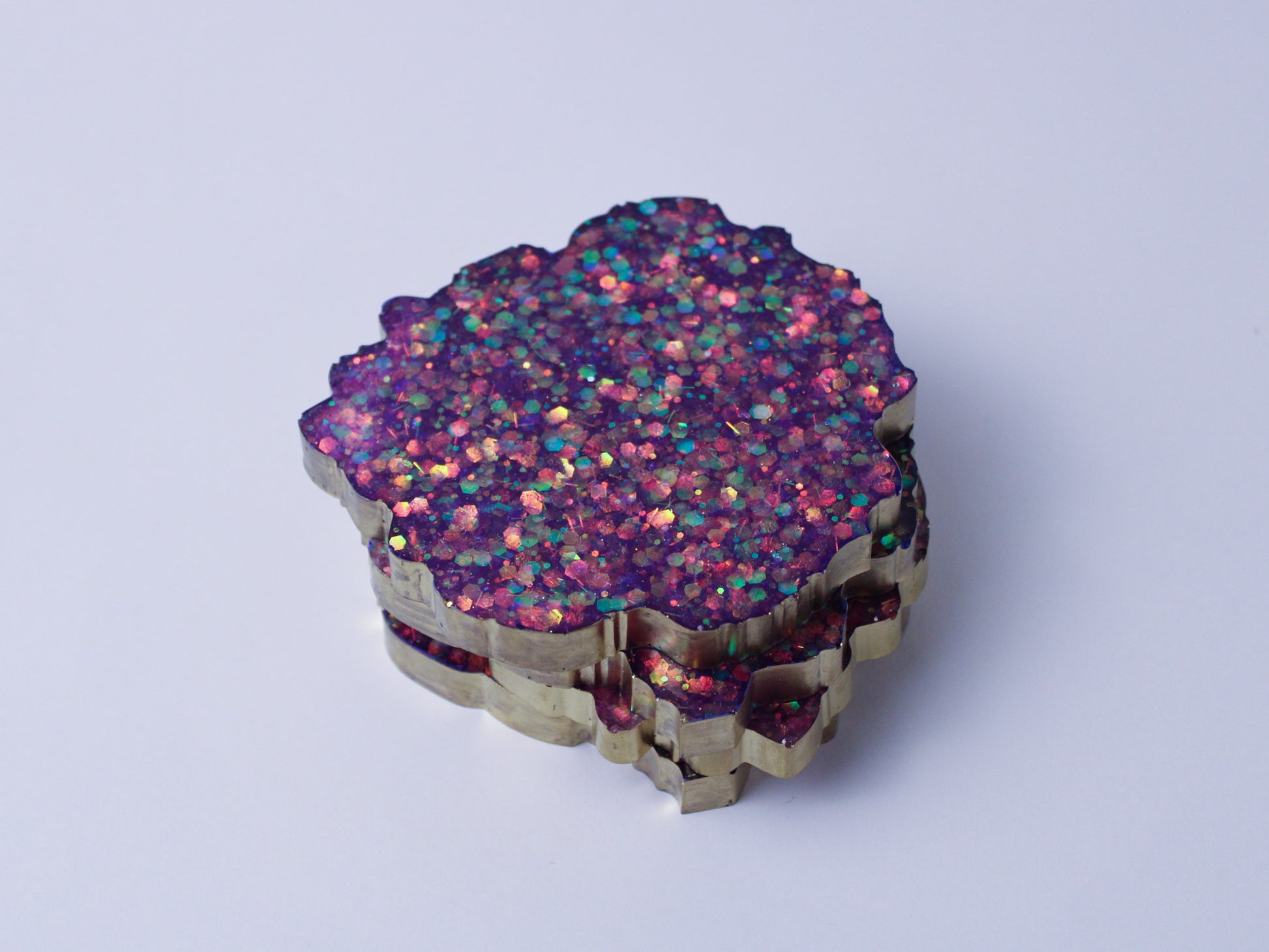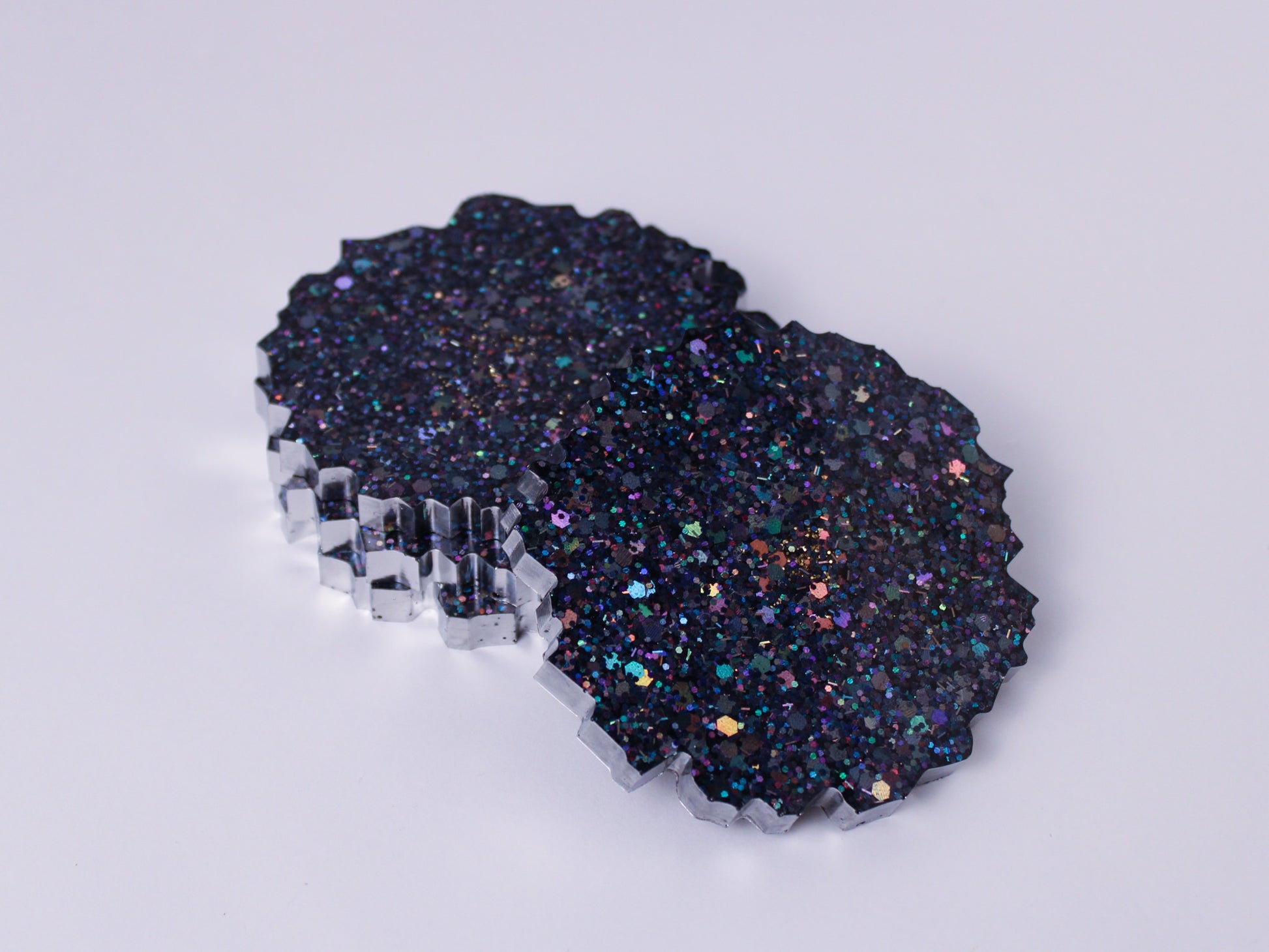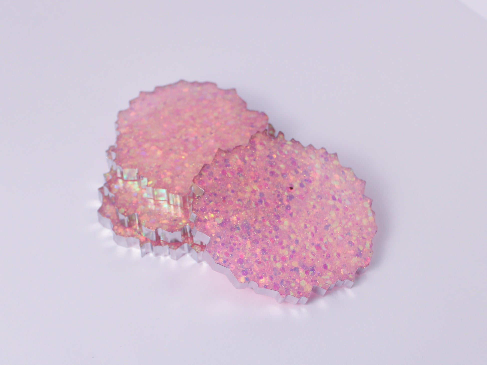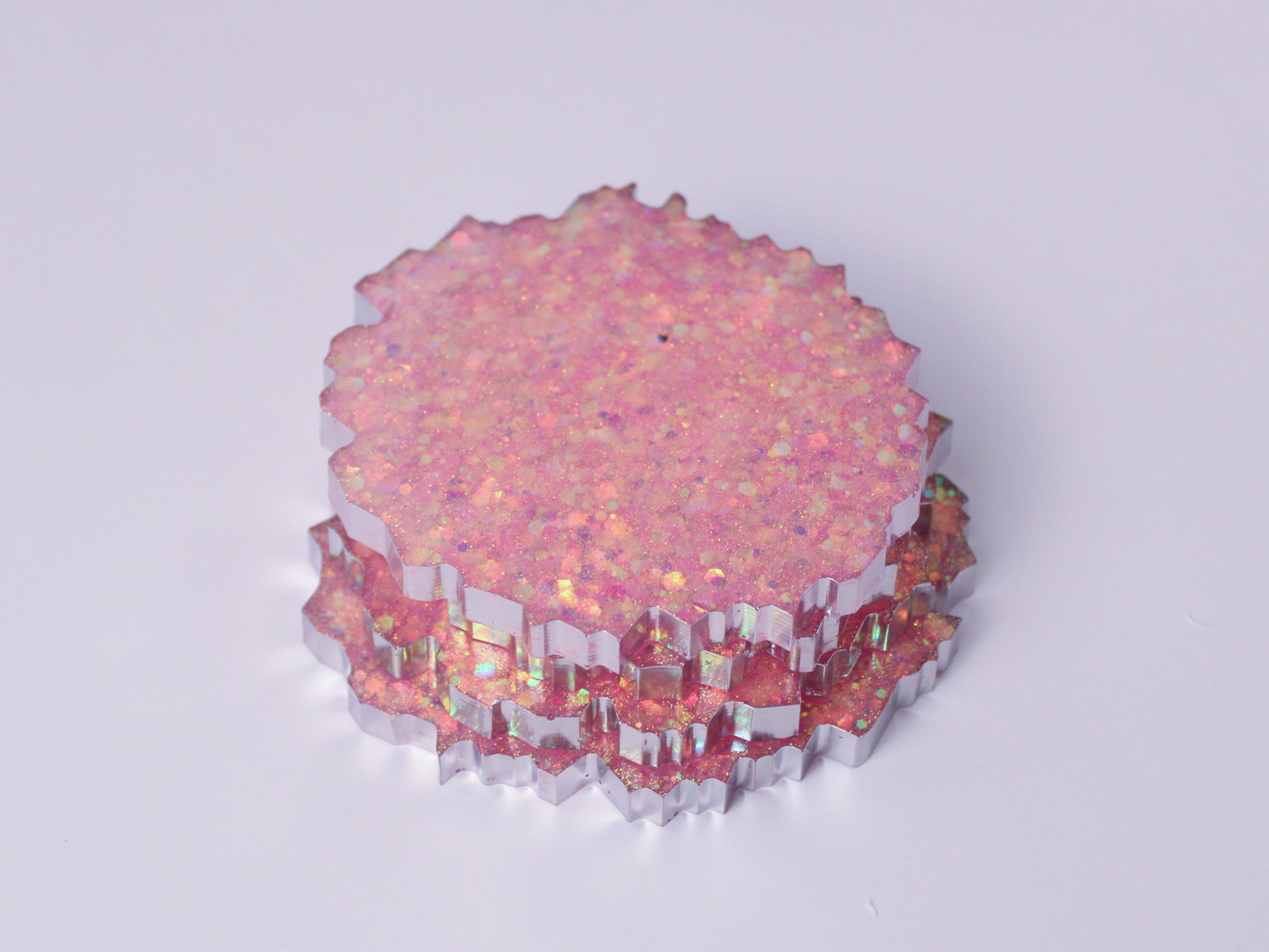 Add some sparkle to your home decor with Glittery Coasters! These unique resin coasters are guaranteed to catch the eye with their glittery and sparkly design. Perfect for protecting surfaces and adding a touch of whimsy to any room. Set of 4 coasters.