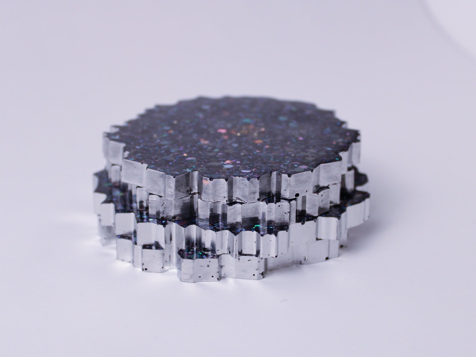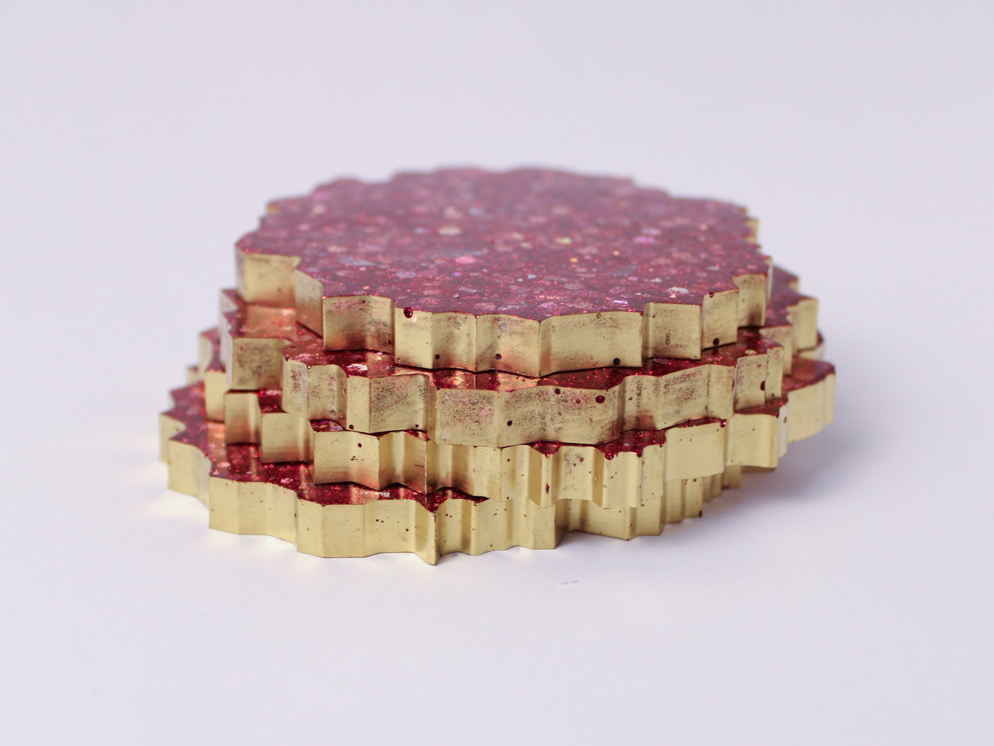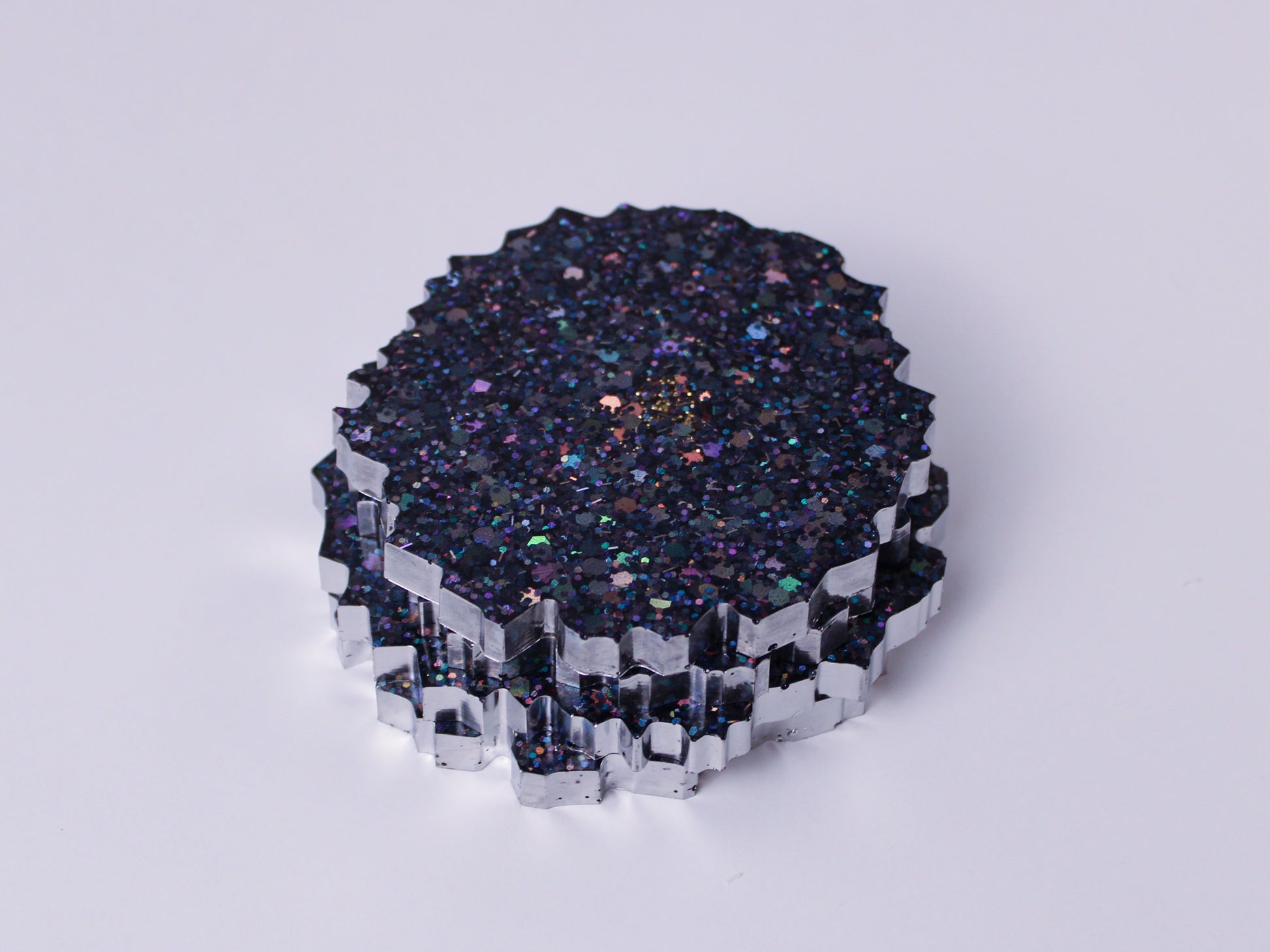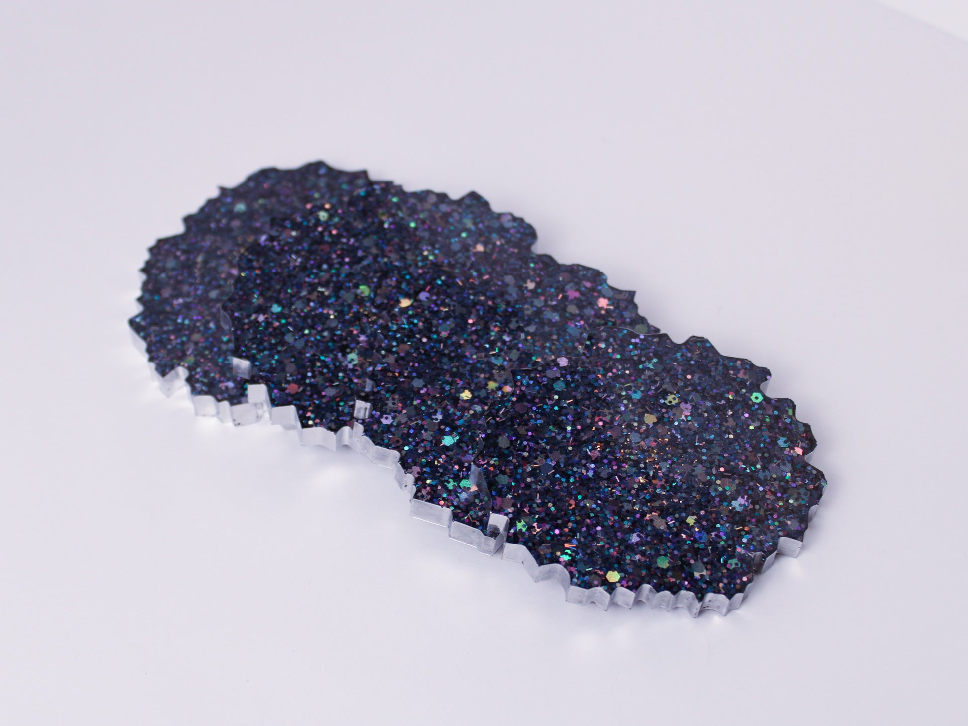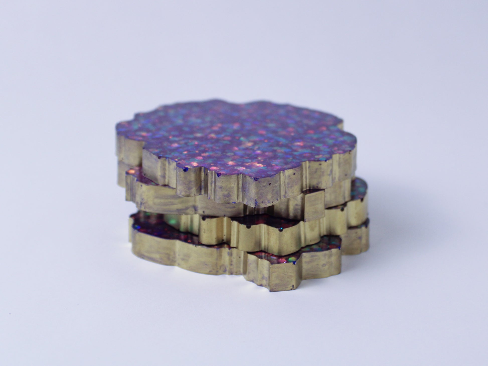 Add some sparkle to your home decor with Glittery Coasters! These unique resin coasters are guaranteed to catch the eye with their glittery and sparkly design. Perfect for protecting surfaces and adding a touch of whimsy to any room. Set of 4 coasters.